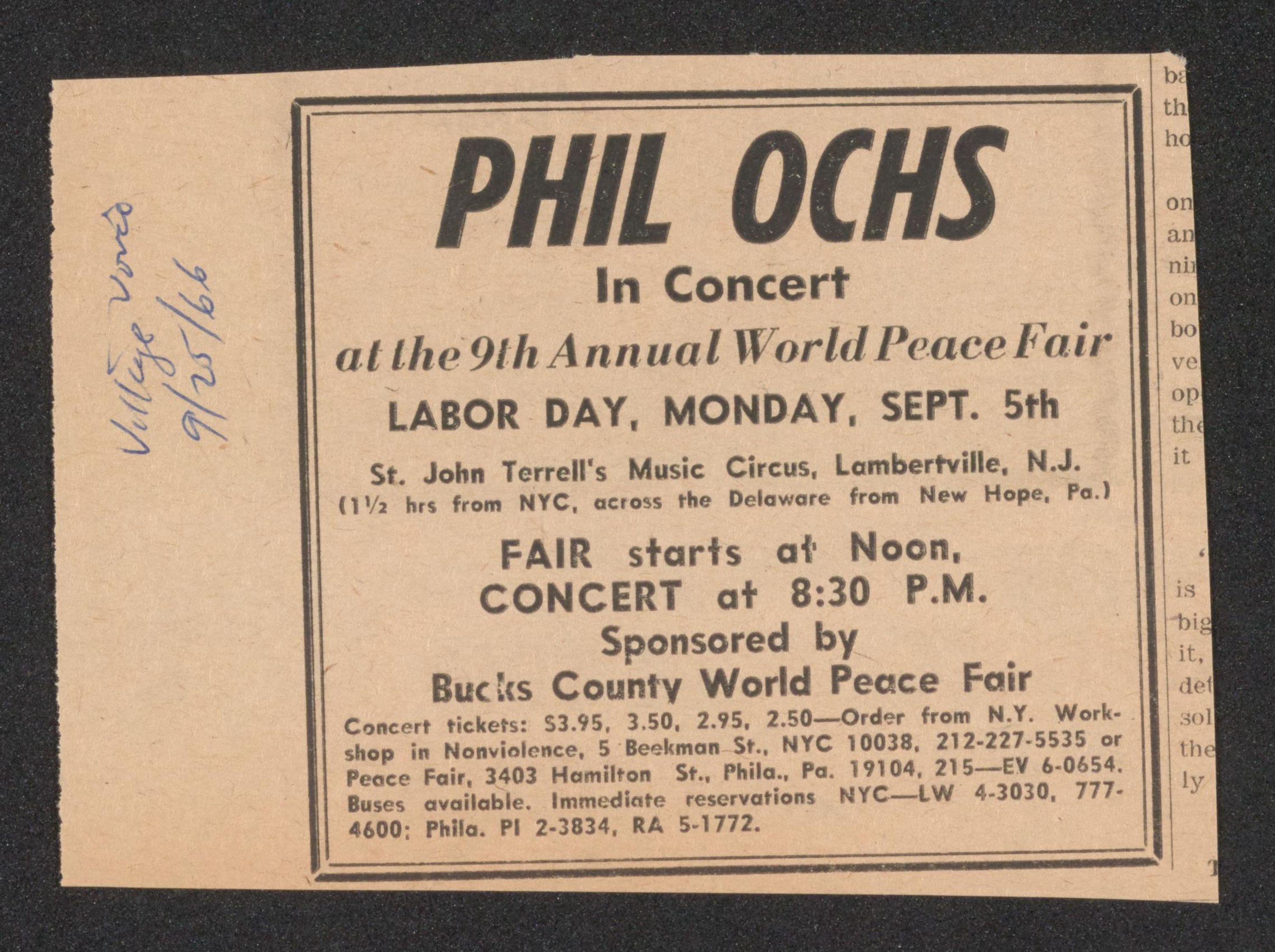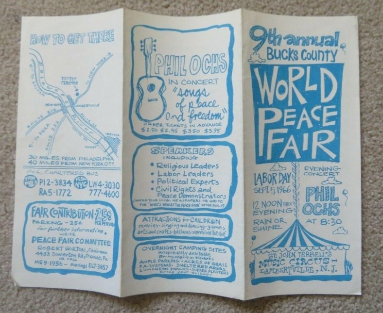 September 5, 1966 – Lambertville, NJ – St. John Terrell’s Music Circus (9th Annual World Peace Fair) Share this:Tweet Click to email a link to a friend (Opens in new window) Email Click to print (Opens in new window) Print Like Loading... Related Leave a comment Cancel reply Δ