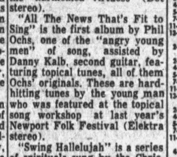 There were other recordings dating roughly from the era of the first album sessions, though the exact dates haven’t been pinpointed. Producer Elliot Mazer recalls doing an unreleased demo with Phil for Cameo-Parkway around 1964, and the 1980s compilation A Toast to Those Are Gone presented previously unissued early demos, most or all of which sound as if they come from Ochs’s very early career. Five tracks (including an early version of one of his most famous compositions, “There But For Fortune”) landed on the 1964 Vanguard compilation New Folks, a couple of outtakes from those sessions surfacing on a 2000 CD anthology. Several dozen of his compositions had already appeared in the influential folk magazine Broadside prior to All the News That’s Fit to Sing, and the singer informally taped dozens of songs for the publication in his early days in New York, a good many of these recordings finding release after the 1960s. Too, his songs were already starting to get covered by other artists, the Modern Folk Quartet interpreting Phil’s adaptation of Edgar Allan Poe’s “The Bells,” and the Four Seasons doing an unlikely version of “New Town” (which Ochs never put out himself) on their folk album Born to Wander in early 1964.