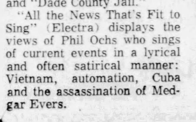 This was Phil’s first official album. It was released in April of 1964 on Elektra Records (EKL-269(mono)-EKS7269). It clearly reflects Phil’s interest in topical songwriting, with many of the songs referencing the news of the days. Even the title itself was a play on the motto of the New York Times.
