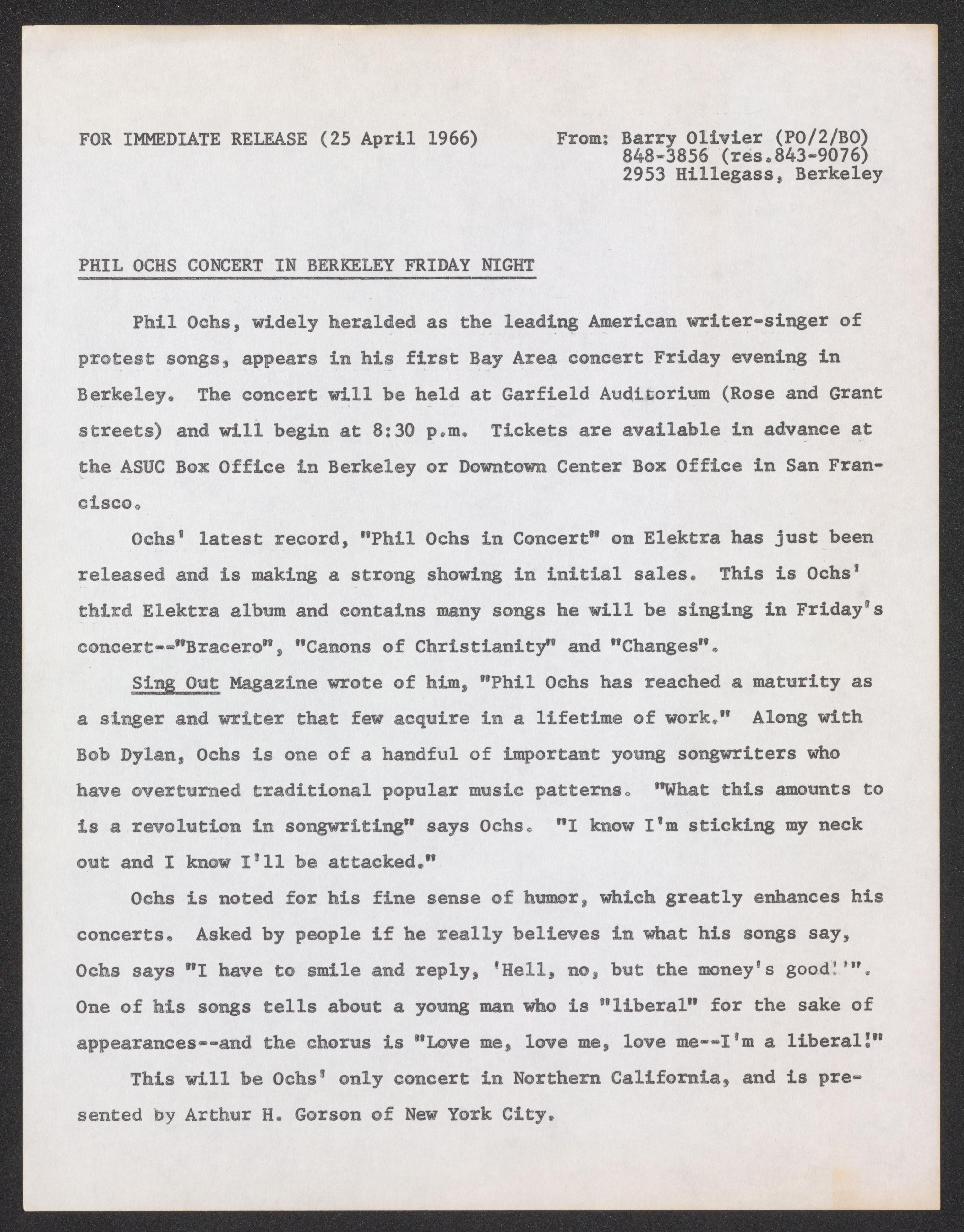 April 29, 1966 – Berkeley, CA Phil Ochs – Berkeley 1966 concert. Share this:Tweet Click to email a link to a friend (Opens in new window) Email Click to print (Opens in new window) Print Like Loading...