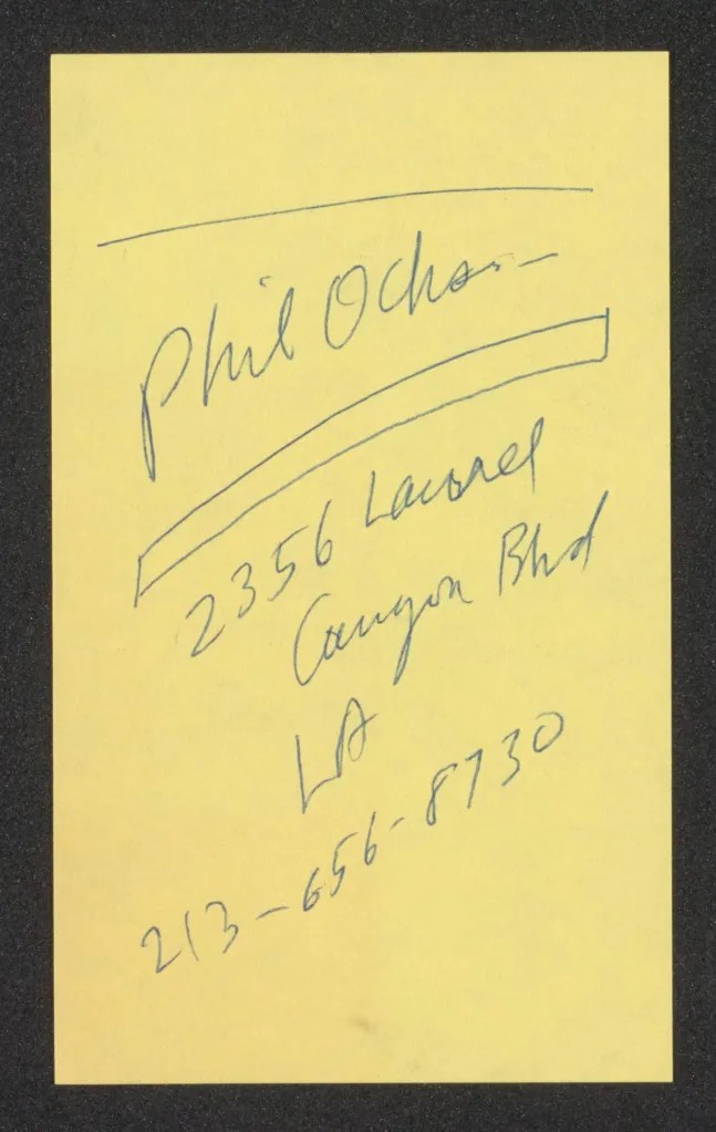 Program dedicated to political songwriter and performer Phil Ochs (1940-1976) that includes a May 1973 Studs Terkel interview with Ochs and close friend Bob Gibson, and Ed Pearl interviewing Ochs’ brother and manager Michael. Studs Terkel interview includes Ochs and Gibson singing songs from and discussing Ochs’ life and musical career. Michael Ochs talks to Ed Pearl about Phil and plays songs from Chords of Fame, a best-of compilation Michael produced months after Phil’s death. Broadcast on KPFK in 1981.