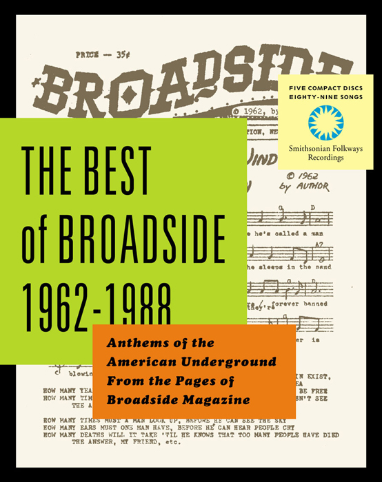 The Best of Broadside, Anthems of the American Underground from the Pages of Broadside Magazine. Eighty-nine songs, including some never commercially released. Compiled and annotated by Jeff Place and Ronald D. Cohen. A five CD boxed set. Broadside was a small underground magazine smuggled out of a New York City housing project in a baby carriage, filled with new songs by artists who were too creative for the folkies and too radical for the establishment. A still-underground Bob Dylan, Janis Ian, Rev. Frederick Douglass Kirkpatrick, Phil Ochs, Malvina Reynolds, Buffy Sainte-Marie, Pete Seeger, and dozens of others first published songs like “Blowin’ in the Wind,” “Little Boxes,” and “Society’s Child,” in Broadside. The Best of Broadside features 89 songs from the Folkways collection, tapes from the Broadside magazine office, and some tracks released on other labels. The set contains a variety of performers, topics, and musical styles that tell tales spanning the 25 years of the Broadside era (1962-1988), but many of them address contemporary issues as well, since the new millennium has not see the end of warfare, nuclear threat, ethnic conflict, immigrants’ suffering, women’s unequal rights, ecological devastation, and social injustice. This is the underground music that fueled the innocent-sounding Folk Revival on the one hand and the explosions of angry rock and rap on the other. The Best of Broadside brings an era, its musicians, and its many stories to a new audience. The extensive notes feature the graphics of the original Broadside magazine and provide information on the careers of its many musicians with extensive discographies, the stories behind most of the songs as well as their full texts. They also describe the dramatic history of the magazine itself—a remarkable achievement of dedicated musicians and social activists.