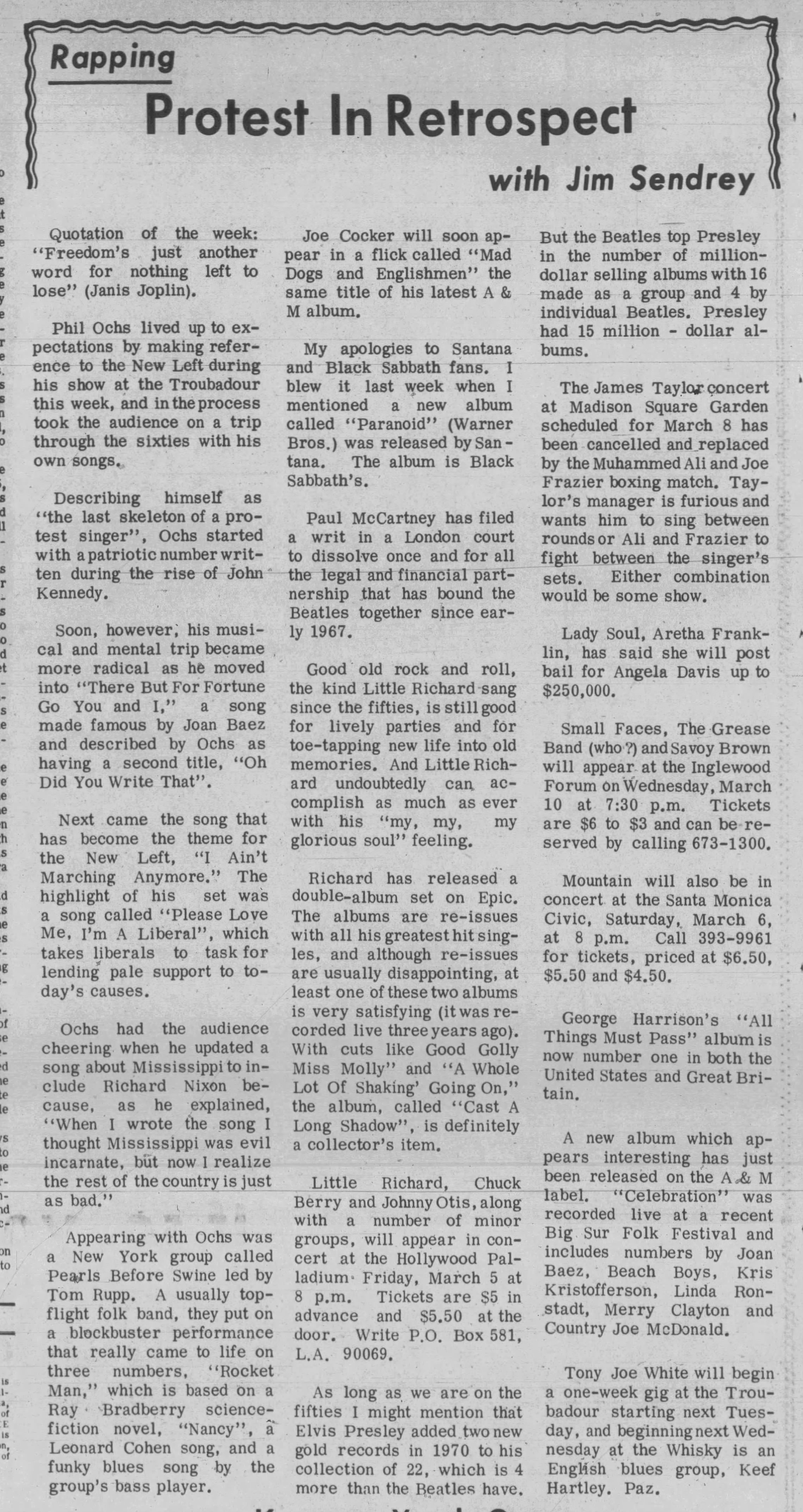 February 16, 1971 – Los Angeles, CA – Troubadour Billboard Mar 6, 1971 Share this:Tweet Click to email a link to a friend (Opens in new window) Email Click to print (Opens in new window) Print Like Loading... Leave a comment Cancel reply Δ