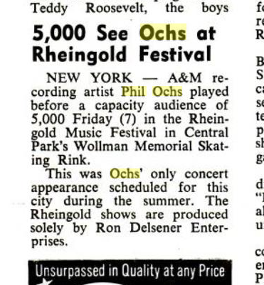I was there. My first time at the Rheingold festival. My sister and I got there late and sat in the last row of the bleachers. We saw Phil Ochs many times. We were at the Gunfight at Carnegie Hall.