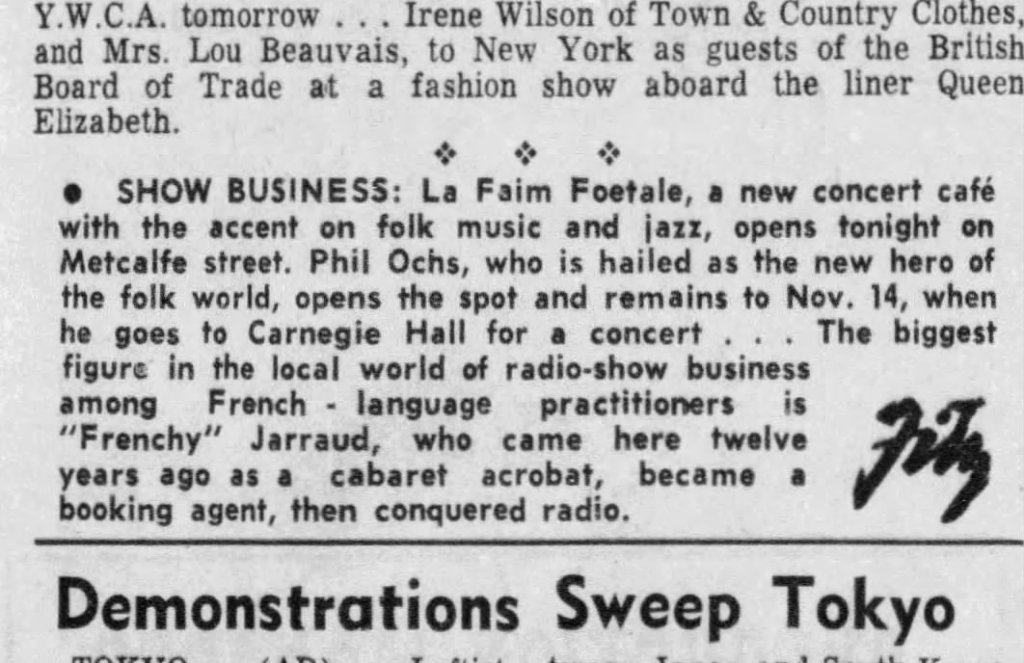 November 9-14, 1965 – Montreal, QC – Faim Foetale Share this:Tweet Click to email a link to a friend (Opens in new window) Email Click to print (Opens in new window) Print Like Loading...